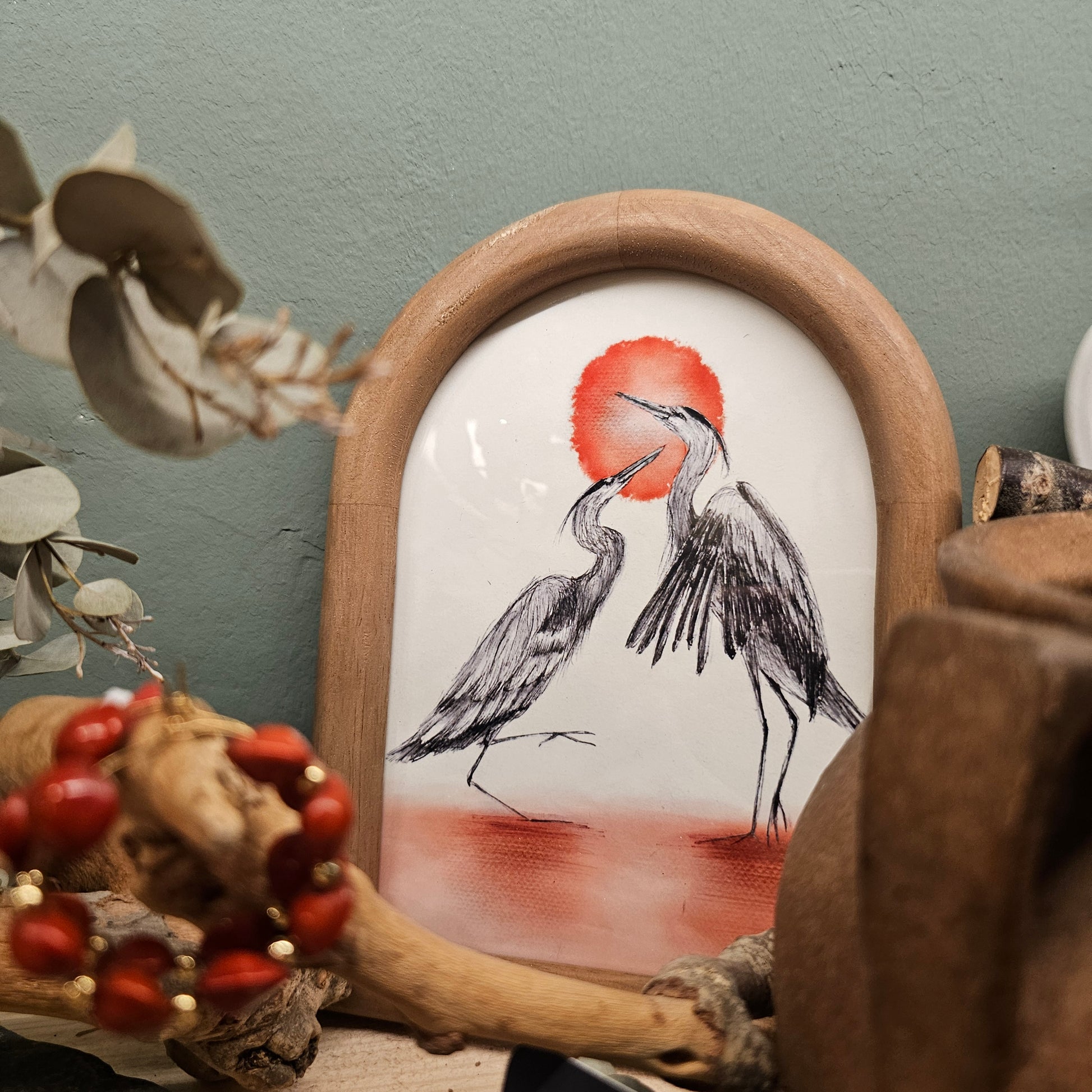 Un cadre élégant représentant deux hérons dans une scène pleine de grâce, inspirée de la nature.