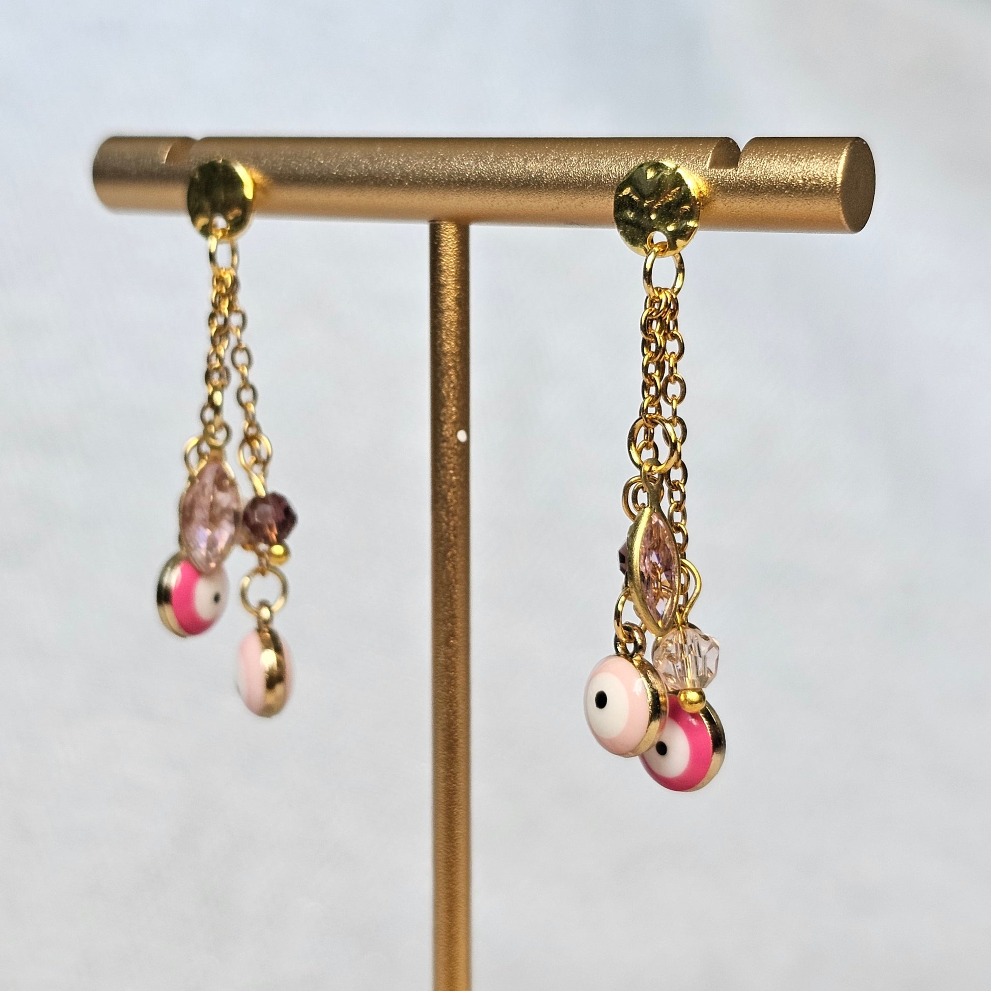 💖 Assemblage de pendentifs en forme d’oeil protecteur rose, symbole porte-bonheur, suspendus à une chaîne de perles facettées au couleur rosées.